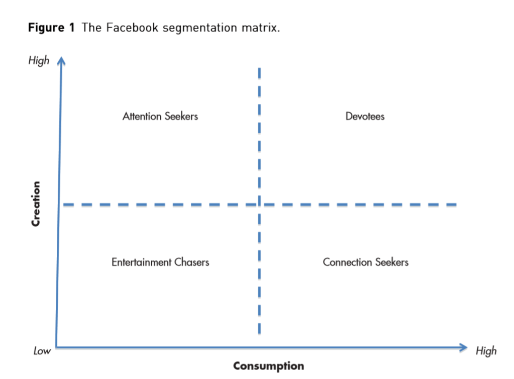 According to Hodis, et al., Facebook’s segmentation matrix is created to classify consumers according to the extent of individual creation and content consumption.
